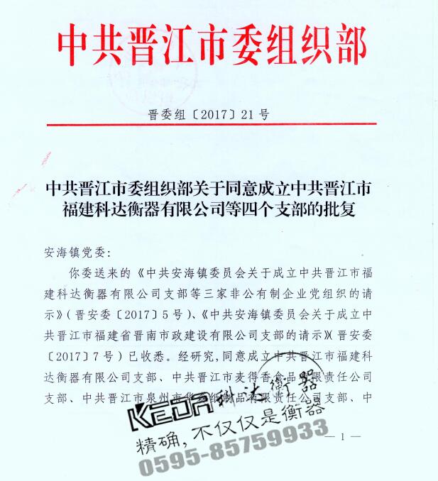 中共晉江市委組織部關于同意成立中共晉江市福建科達衡器有限公司支部的批復