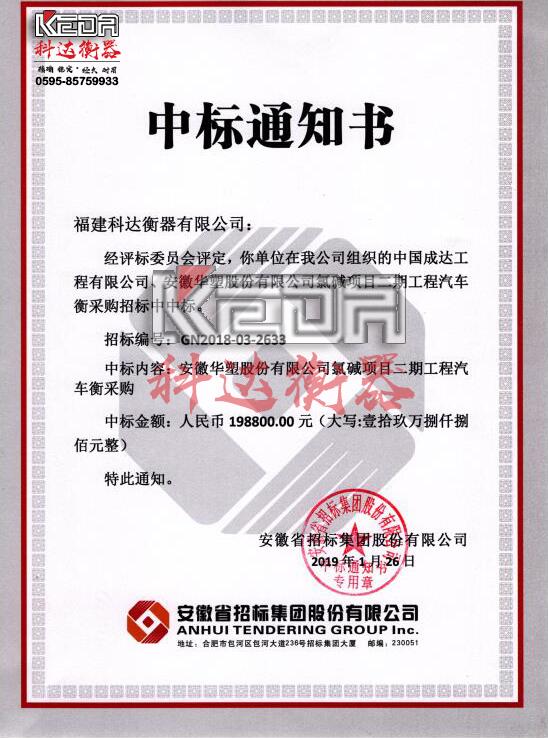 熱烈祝賀福建科達(dá)中標(biāo)安徽氯堿項目汽車衡采購